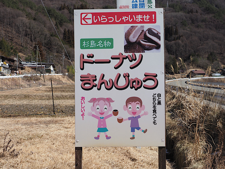 奥原菓子店。看板には、大きく「杉島名物 ドーナツ万十」の文字