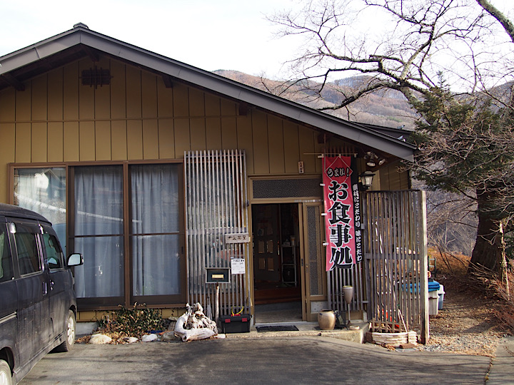 外観は民家そのもの。引き戸の玄関もご自宅兼用だ。「お食事処」の幟旗がなければお店には到底見えないから通り過ぎないようにご用心