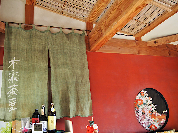 古民家風の立派な梁と竹細工の天井、紅柄そのものを塗り込んだという朱の土壁、そして萌黄色の暖簾(開店時のお祝いにいただいたものだそう)が美しく調和する店内
